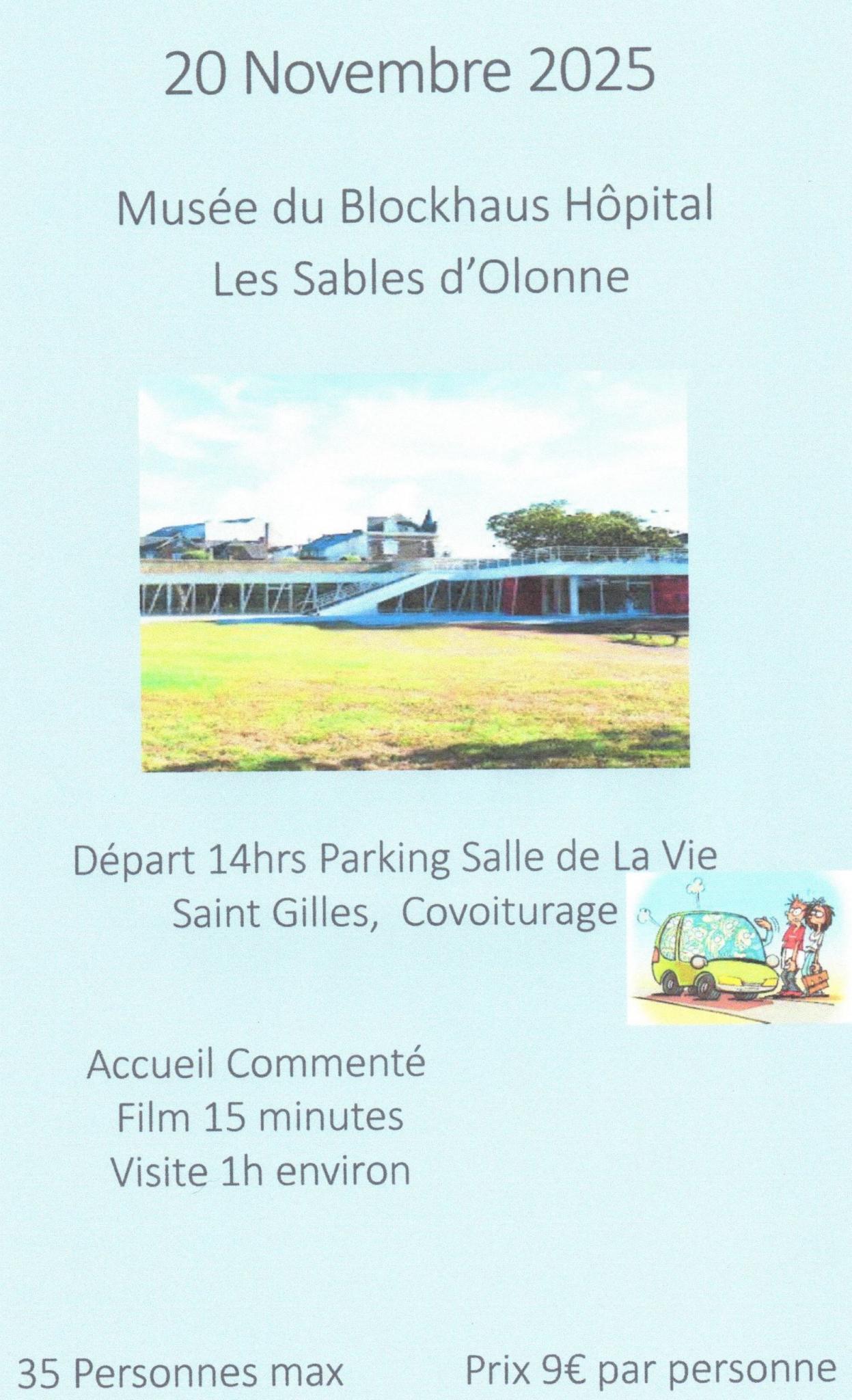 Nous vous proposons une sortie au blockaus hôpital aux Sables D'Olonne le jeudi 20 Novembre en covoiturage. nombre de personnes 35 maxi